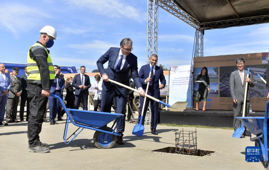 在塞尔维亚首都贝尔格莱德,塞尔维亚总统武契奇(中)为欧洲地区首家中国疫苗工厂奠基(2021年9月9日摄)。新华社发(普雷德拉格·米洛萨夫列维奇摄)