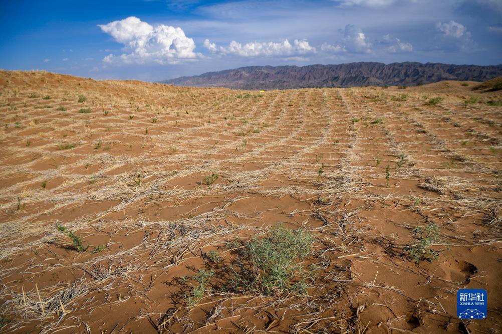 这是位于宁夏中卫市境内的一处沙漠,草方格已将风沙固定,地表长出植被(7月19日摄)。新华社记者 冯开华 摄