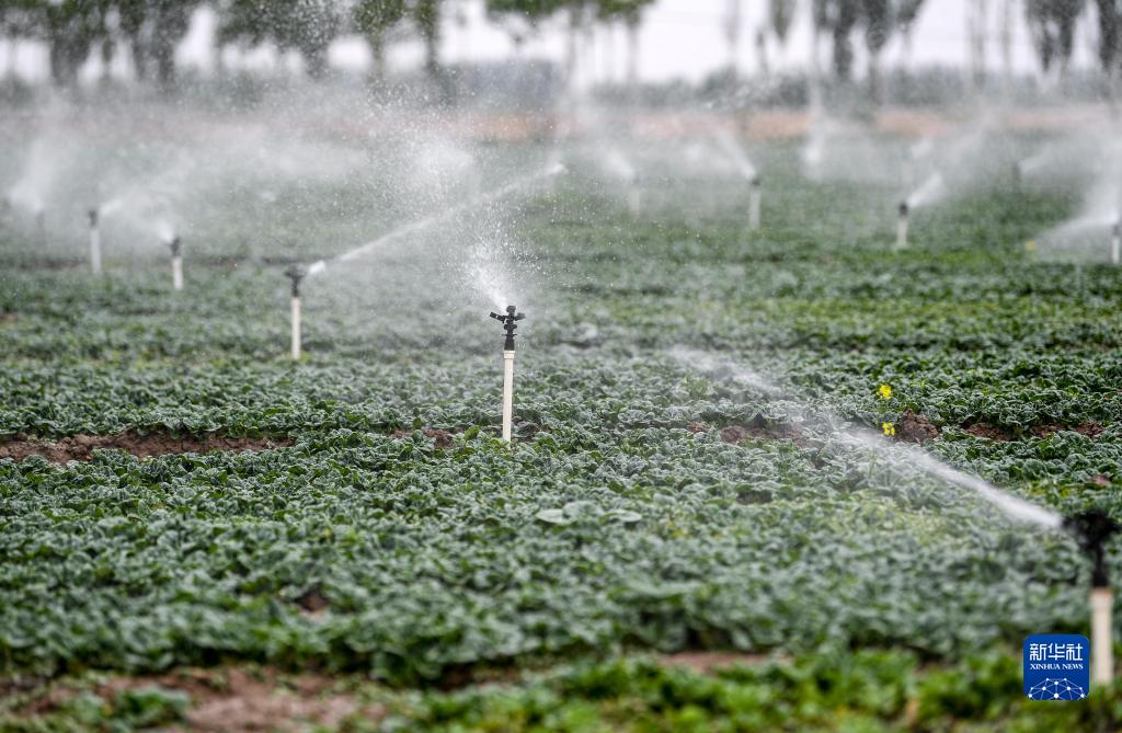 在宁夏银川市永宁县望洪镇宋澄村冷凉蔬菜种植基地,小型喷灌节水设备进行喷灌作业(5月25日摄)。新华社记者 冯开华 摄
