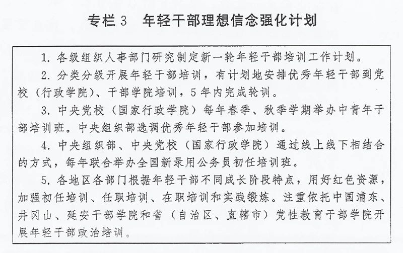 (三)加强年轻干部政治训练。强化习近平新时代中国特色社会主义思想学习教育,突出政治忠诚教育、理想信念教育、纪律规矩教育,加强优良传统作风和责任感使命感教育,强化斗争意识,综合运用理论讲授、政策解读、案例教学、现场体验等方式开展系统培训。党委(党组)负责同志要讲好“开班第一课”。安排思想政治素质过硬、理论水平较高、实践经验丰富的领导干部上讲台授课。探索推行“政治辅导员”、“导师帮带”制度。通过开展党性分析、实践锻炼、过“政治生日”、重温入党誓词等方式,锤炼党性修养、提高政治觉悟。实施年轻干部理想信念强化计划(专栏3)。