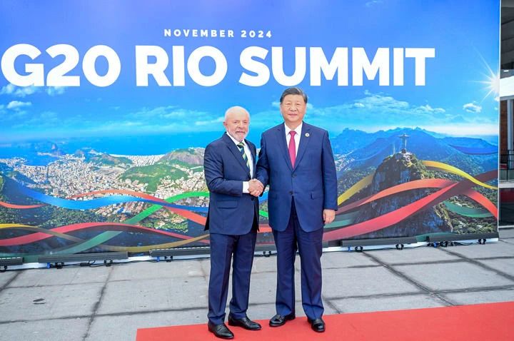 当地时间11月18日上午,国家主席习近平在巴西里约热内卢出席二十国集团领导人第十九次峰会。这是峰会开始前,习近平受到巴西总统卢拉热情迎接。新华社记者 李学仁 摄