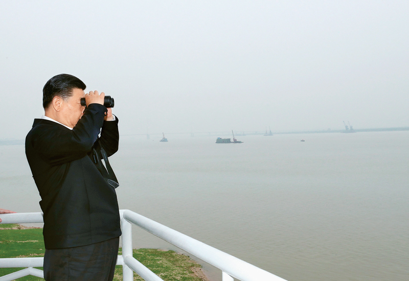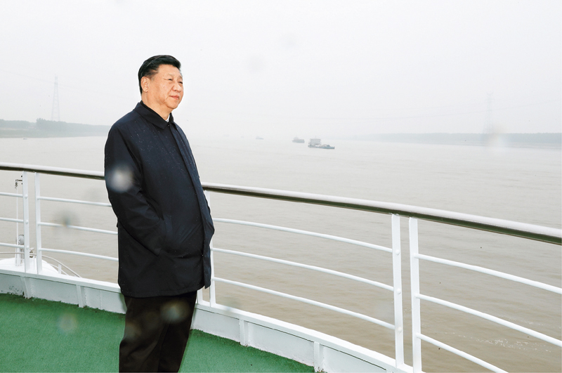 (2018年426日下午,中共中央总书记、国家主席、中央军委主席习近平在武汉主持召开深入推动长江经济带发展座谈会并发表重要讲话。这是座谈会前,习近平于25日上午乘船沿江察看两岸生态环境和发展建设情况。 新华社记者 谢环驰/)