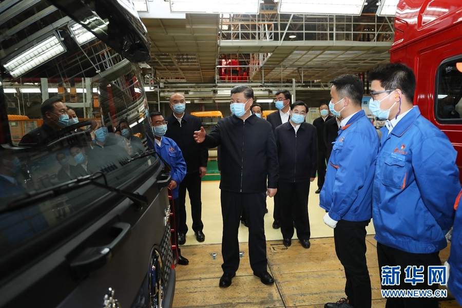 22日,习近平在西安考察复工复产和经济社会恢复运行等情况。陕西汽车控股集团有限公司是西北地区有影响力的制造企业。习近平详细了解产品研发、生产、销售和复工复产情况,对他们克服疫情影响创产销历史新高表示赞赏。总装车间内一片繁忙景象。习近平察看内饰生产线、总装配生产线,饶有兴致登上装配完成的民用重型卡车驾驶室,向技术人员询问产品性能和操作流程。习近平强调,制造业是国家经济命脉所系。国有大型企业要发挥主力军作用,在抓好常态化疫情防控的前提下,带动上下游产业和中小企业全面复工复产。习近平指出,新时代陕西要有勇立潮头、争当时代弄潮儿的志向和气魄,既要抓住西部大开发、共建一带一路等重大机遇,又要善于从眼前的危机和挑战中抢抓和创造机遇,不断发展新模式、新业态、新技术、新产品,创造新的更大业绩,迈上新的台阶。