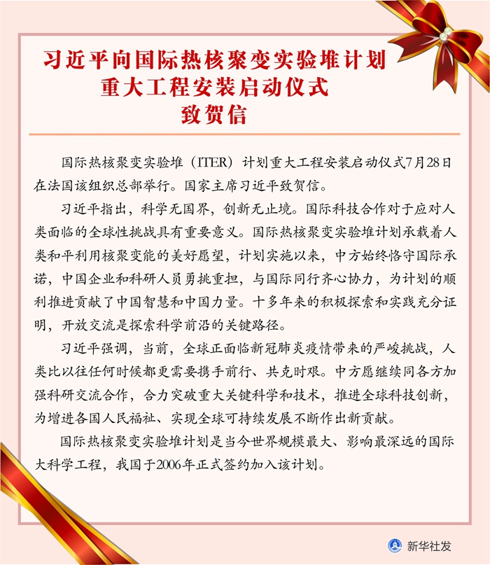 习近平向国际热核聚变实验堆计划重大工程安装启动仪式致贺信