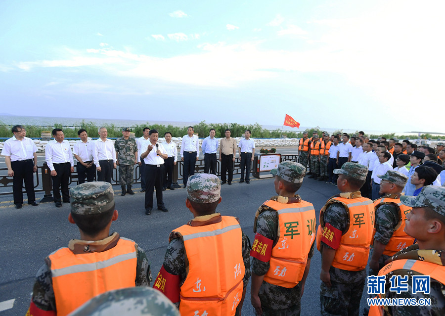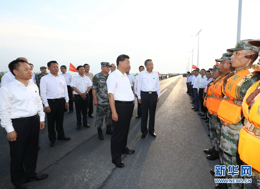 大堤上,习近平亲切看望慰问了在防汛抗洪救灾斗争中牺牲同志的家属、防汛抗洪一线人员、先进典型代表和参加抗洪抢险的部队官兵,并向全国奋战在防汛抗洪救灾一线的同志们表示诚挚的问候。他强调,今年入汛以来,南北方江河湖泊接连出现超警戒水位险情。广大干部群众和人民解放军、武警官兵坚决响应党和政府号召,发扬不怕累苦、不怕疲劳、不怕牺牲的精神斗志,坚守在防汛抗洪救灾第一线,涌现了许多先进典型和感人事迹,展现了中国人民众志成城、顽强拼搏、敢于胜利的英雄气概,书写了洪水无情人有情的人间大爱。党和人民感谢你们!