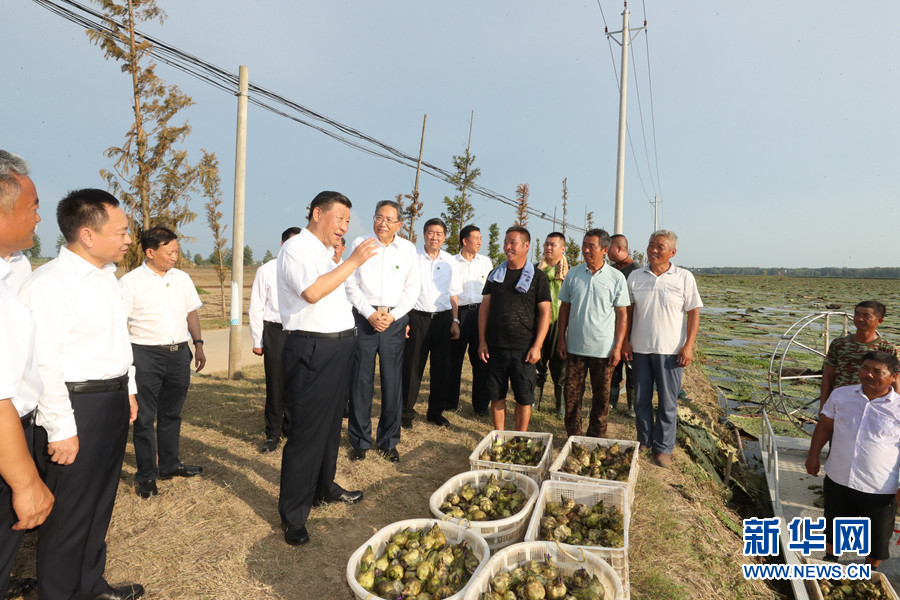 8月18日至21日,中共中央总书记、国家主席、中央军委主席习近平在安徽省考察。这是18日下午,习近平在阜阳市阜南县蒙洼蓄洪区,同正在采摘芡实的乡亲们亲切交流,了解灾后生产恢复情况。 新华社记者 鞠鹏 摄